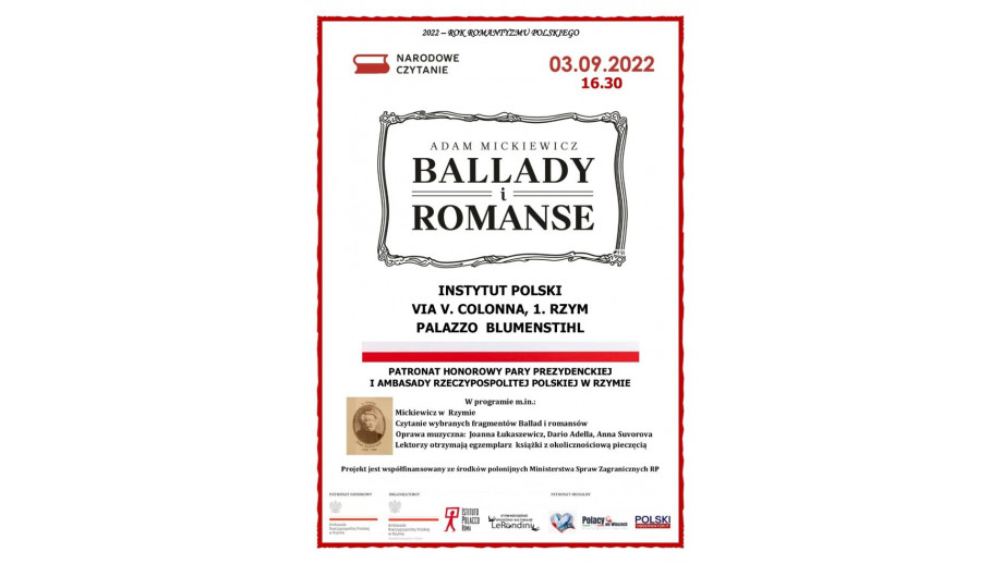 Akcję wspólnej lektury „Ballad i romansów” Adama Mickiewicza zorganizowano w sobotę w Instytucie Polskim w Rzymie w ramach 11. edycji Narodowego Czytania. Inicjatorem spotkania w polskiej placówce nad Tybrem w Roku Romantyzmu Polskiego było polonijne Stowarzyszenie Promocji Społecznej i Kulturalnej Le Rondini.