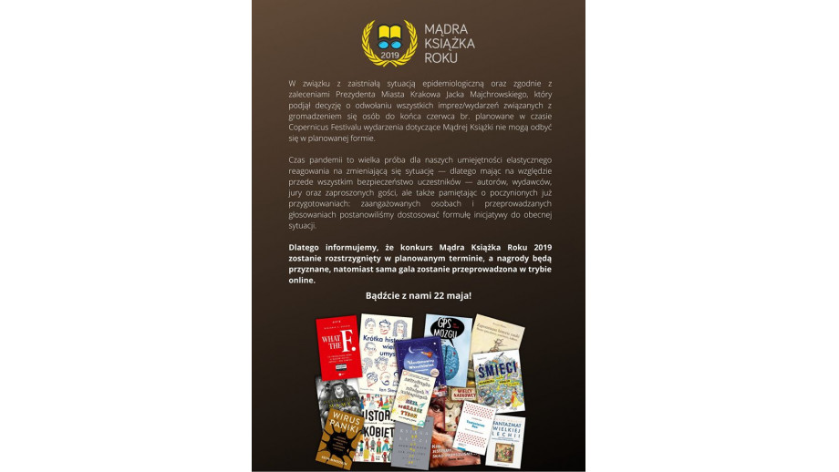 Konkurs Mądra Książka Roku 2019 wyróżniający najlepsze wydane w Polsce książki popularnonaukowe zostanie rozstrzygnięty 22 maja, czyli w planowanym terminie, jednak sama gala zostanie przeprowadzona w trybie online.