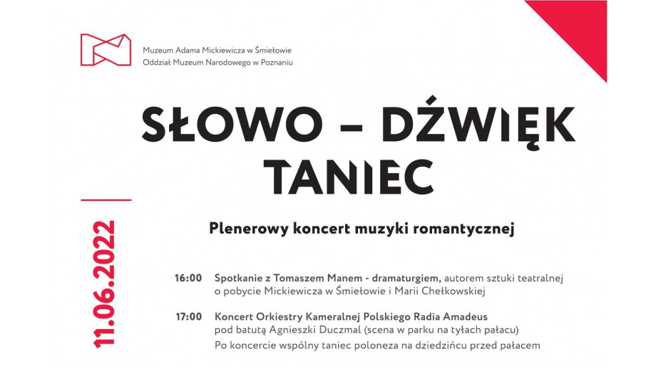 W najbliższą sobotę 11 czerwca w Muzeum im. Adama Mickiewicza w Śmiełowie odbędzie się wyjątkowe wydarzenie w ramach obchodów Roku Romantyzmu Polskiego. Zapraszamy na spotkanie z Tomaszem Manem, autorem spektaklu, poświęconego dziejom Śmiełowa, Adama Mickiewicza i Marii Chełkowskiej, oraz koncert muzyki romantycznej w wykonaniu Orkiestry Kameralnej Polskiego Radia „Amadeus” pod batutą Agnieszki Duczmal. Projekt realizują Muzeum Narodowe w Poznaniu i Instytut Książki.