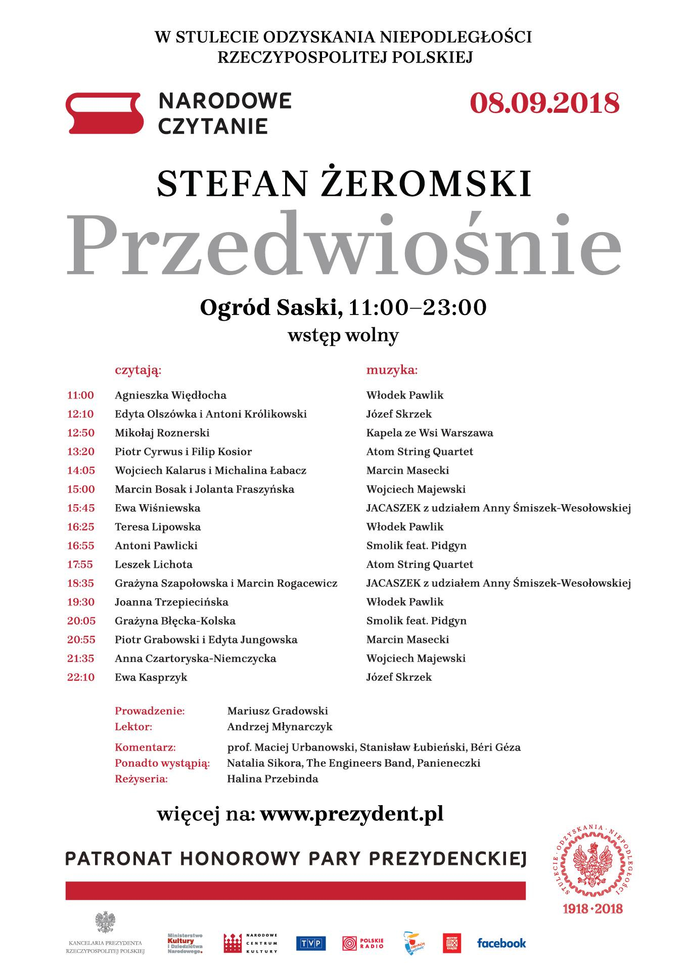 8 września 2018 r. zapraszamy do Ogrodu Saskiego w Warszawie na wspólne czytanie „Przedwiośnia” Stefana Żeromskiego. Inauguracji wydarzenia towarzyszyć będzie występ Natalia Sikora, Warsaw Village Band/Kapela ze Wsi Warszawa oraz Zespołu Politechniki Warszawskiej, The Engineers Band, którzy zaprezentują swoją interpretację utworu „Nim przyjdzie wiosna” Czesława Niemena.
