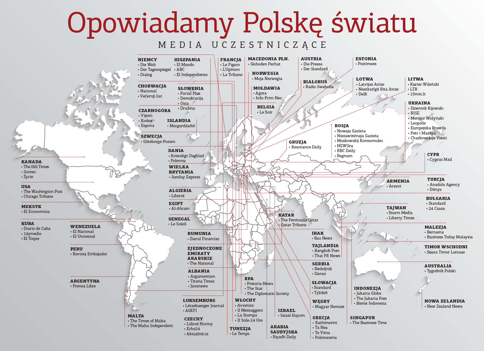 Teksty trafiły do ponad 50 redakcji na całym świecie, w najbliższych dniach będą publikowane m.in. we Francji, Niemczech, Włoszech, USA, Rosji, czy odległej Japonii – informuje PAP Eryk Mistewicz, prezes Instytutu Nowych Mediów, inicjator i organizator projektu „Opowiadamy Polskę światu”.