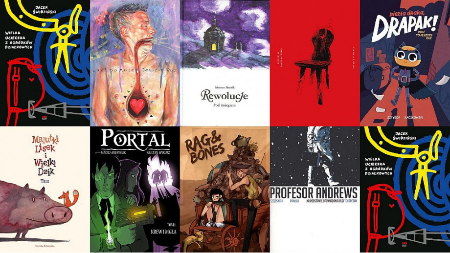 Pracowity rok ma za sobą Dominik Szcześniak, którego nazwisko jako scenarzysty można znaleźć na okładkach kilku albumów – dwuczęściowej mini serii Ksionz (z Marcinem Rusteckim), kontynuacji postapokaliptycznego Rag & Bones (z Katarzyną Babis), krótkiego Profesora Andrewsa (z Grzegorzem Pawlakiem), będącego wierną adaptacją opowiadania Olgi Tokarczuk, oraz w pełni autorskiego albumu pt. Robaczki. Nie próżnował także Bartosz Sztybor, który wspólnie z Tomaszem Kaczkowskim stworzył dla Egmontu postać sympatycznego dziecięcego superbohatera, Drapaka. Równocześnie Sztybor napisał poruszający, osobisty scenariusz o uzależnieniach, do brawurowo zilustrowanego przez Wojciecha Stefańca albumu Wróć do mnie, jeszcze raz. Aż trudno uwierzyć, że te dwa, skrajnie przecież różne teksty, wyszły z grubsza w tym samym czasie spod jednej ręki. Warto też odnotować pojawienie się nowego, dziewiątego już albumu z serii „Rewolucje″ autorstwa Mateusza Skutnika, pt. pod Śniegiem.