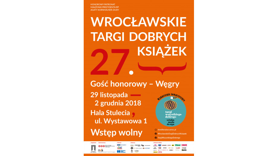 Gościem honorowym Wrocławskich Targów Dobrych Książek będą w tym roku Węgry. Czekają nas spotkania z węgierskimi pisarzami i wiele okazji, by bliżej poznać tamtejszą literaturę zarówno dla dorosłych, jak i dla dzieci. W programie węgierskim czeka nas m.in. spotkanie wokół literatury węgierskiej z udziałem Anny Butrym, Ireny Makarewicz i Marcina Skrabki połączone z prezentacją programu edukacyjnego dla bibliotekarzy „Dwa bratanki”, spotkanie z prof. Istvánem Kovácsem i prezentacja książek jego autorstwa o tematyce historycznej. Targi odwiedzi także Teresa Worowska, tłumaczka Sándora Máraiego, która opowie o najnowszych polskich wydaniach dzieł tego najbardziej znanego węgierskiego autora oraz o mało znanych wybitnych klasykach węgierskich, a zwłaszcza o Antalu Szerbie, autorze unikatowej książki „Podróżny i światło księżyca”. Koniecznie trzeba przyjść na spotkanie z Lajosem Grendelem – żywym klasykiem absurdu środkowoeuropejskiego. W jego najnowszej powieści „Życie w cztery tygodnie” czytelnik odnajdzie ciepłą ironię Bohumila Hrabala, psychologizm Miklósa Mészölya, eseistyczny ton Pavla Vilikovskiego i groteskę Sławomira Mrożka oraz nostalgię Antoniego Czechowa. Wyjątkowo interesująco zapowiada się także spotkanie z ekspertami i autorami nowych książek o tematyce futbolowej. W rozmowie o Puskásu, złotej jedenastce i o miłości do piłki nożnej udział wezmą: Michał Listkiewicz, György Szöllősi i Norbert Tkacz. W paśmie węgierskim czeka nas także premiera najnowszej książki Pétera Esterházyego, laureata Literackiej Nagrody Europy Środkowej Angelus 2008, pt. „Podróż w głąb pola karnego”. O autorze i o książce opowie tłumaczka Elżbieta Sobolewska (laureatka Angelusa 2018 za przekład). Nie zabraknie także spotkania z Viktorem Horváthem – outsiderem literatury węgierskiej, autorem „Tureckiego lustra” i nowej powieści „Mój czołg”. Odbędzie się także rozmowa o korespondencji legendarnego redaktora Jerzego Giedroycia z węgierskim polonistą i poetą Györgyem Gömörim. Ponadto w programie węgierskim znajdziemy warsztaty dla dzieci i rodziców, grę historyczną i spotkania dla dzieci wokół węgierskich bajek. Codziennie po południu będzie można posłuchać w ramach projektu „Audiobook na żywo” czytania literatury węgierskiej w wykonaniu wrocławskich aktorów, Agaty Skowrońskiej i Dariusza Bereskiego.