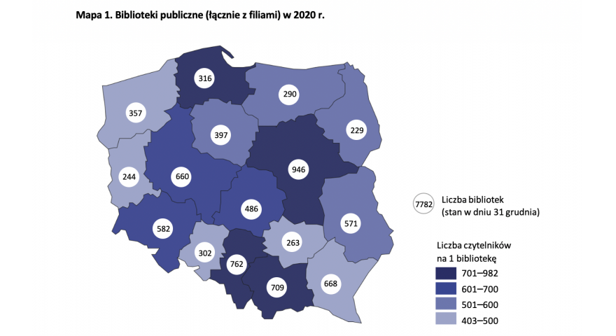 Główny Urząd Statystyczny opublikował raport na temat bibliotek publicznych w Polsce za 2019 rok. Według stanu na 31 grudnia, funkcjonowało 7 881 bibliotek publicznych, w tym 5 272 filie bilioteczne. Bilioteki publiczne prowadziły 875 oddziałów dla dzieci i młodzieży oraz 995 punktów bibliotecznych. W ciągu roku 5 983,7 tys. czytelników wypożyczyło na zewnątrz 102,7 mln woluminów księgozbioru.