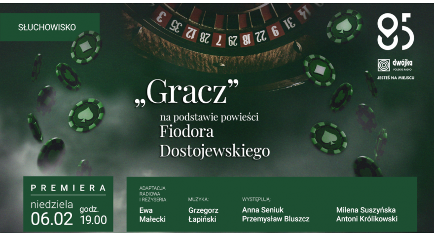W najbliższą niedzielę 6 lutego o 19.00 na antenie Dwójki odbędzie się premiera słuchowiska według powieści „Gracz” Fiodora Dostojewskiego. W obsadzie znakomitości trzech aktorskich pokoleń: Anna Seniuk, Przemek Bluszcz, Milena Suszyńska i Antoni Królikowski.