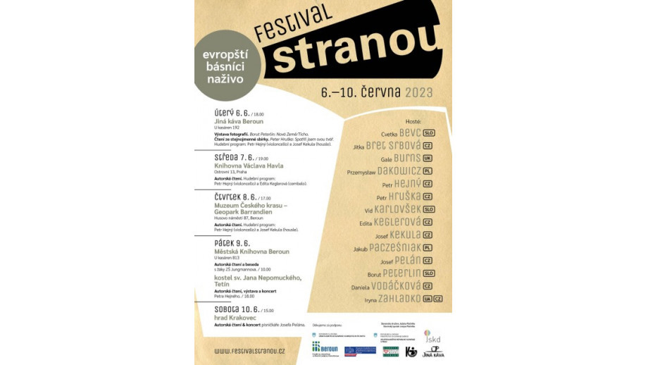 The STRANOU Festival has been held annually since 2008. It brings together poets and often also musicians from European countries, especially from Central and Eastern Europe. Author meetings, discussions, and concerts take place over several days, and exhibitions of paintings or photographs are opened. This year, the venues for the artists' performances include the Vaclav Havel Library in Prague, the Jina kava café in Beroun, the Museum of Bohemian Karst and the Berouna Public Library, as well as the Church of St John of Nepomuk in Tetín and the Krakovec Castle.