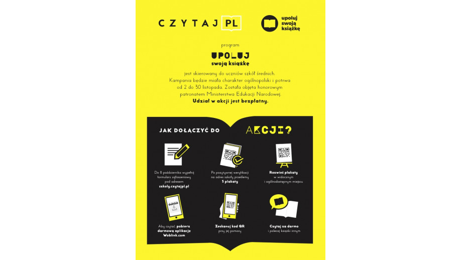 Aby zgłosić szkołę do akcji, należy do dnia 11 października wypełnić formularz pod adresem szkoly.czytajpl.pl. Na adres każdej szkoły prześlemy trzy plakaty, które należy umieścić w widocznym, ogólnodostępnym miejscu, tak aby wszyscy uczniowie mieli możliwość wzięcia udziału w akcji. Materiały zostaną zaadresowane na nazwisko wskazanego w formularzu koordynatora akcji w danej szkole (np. nauczyciel lub bibliotekarz).