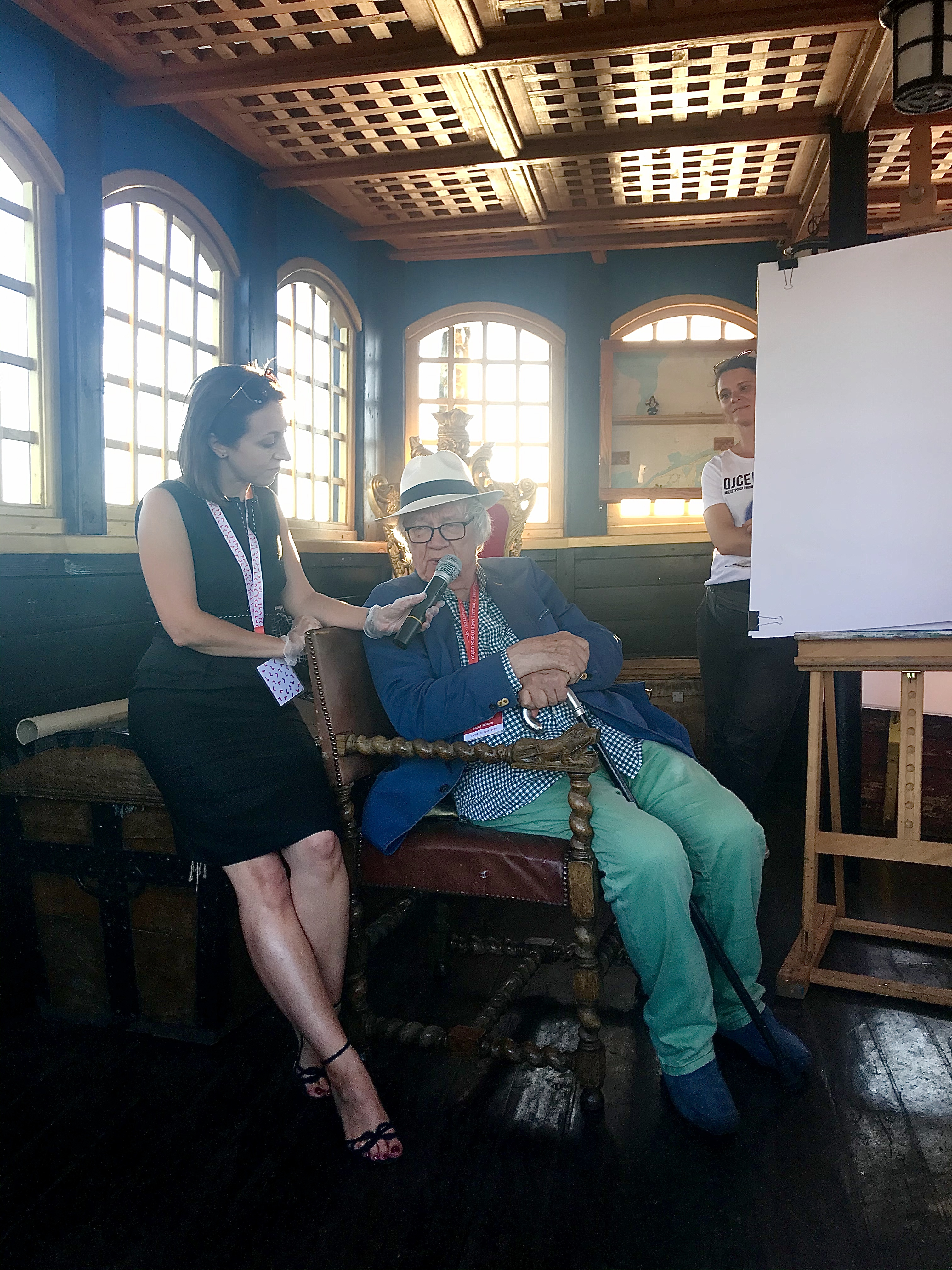 Józef Wilkoń przeprowadził dla najmłodszych warsztaty rozwijające wyobraźnię – pokazywał, jak barwne plamy farb mogą dzięki naszej kreatywności zamieniać się w niepowtarzalne obrazy, biegnące konie czy finezyjne ryby.