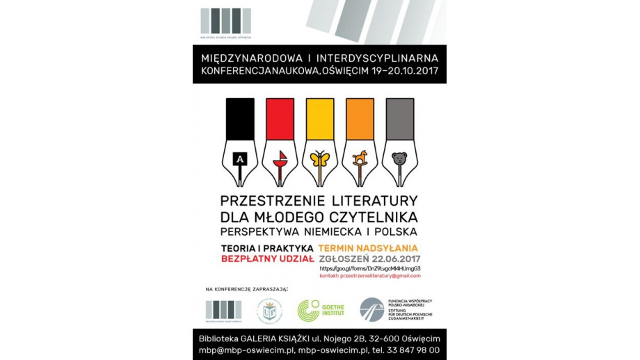 Miejska Biblioteka Publiczna im. Ł. Górnickiego GALERIA KSIĄŻKI w Oświęcimiu, Goethe-Institut w Krakowie, Uniwersytet Pedagogiczny im. Komisji Edukacji Narodowej w Krakowie zapraszają na międzynarodową i interdyscyplinarną konferencję: „Przestrzenie literatury dla młodego czytelnika. Perspektywa niemiecka i polska”. Wydarzenie odbędzie się  w Oświęcimu, 19 i 20 października 2017 roku.