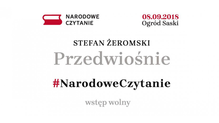 8 września 2018 r. zapraszamy do Ogrodu Saskiego w Warszawie na wspólne czytanie „Przedwiośnia” Stefana Żeromskiego. Inauguracji wydarzenia towarzyszyć będzie występ Natalia Sikora, Warsaw Village Band/Kapela ze Wsi Warszawa oraz Zespołu Politechniki Warszawskiej, The Engineers Band, którzy zaprezentują swoją interpretację utworu „Nim przyjdzie wiosna” Czesława Niemena.