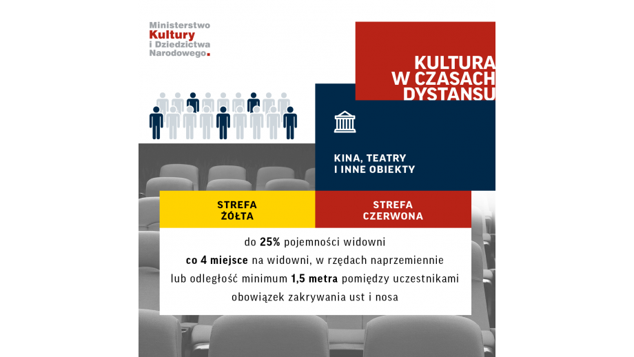 Zgodnie z nowymi zasadami bezpieczeństwa sanitarnego, od soboty, 17 października, wydarzenia kulturalne mogą się odbywać z udziałem 25 proc. publiczności, przy udostępnieniu co czwartego miejsca lub przy zachowaniu 1,5 odległości.