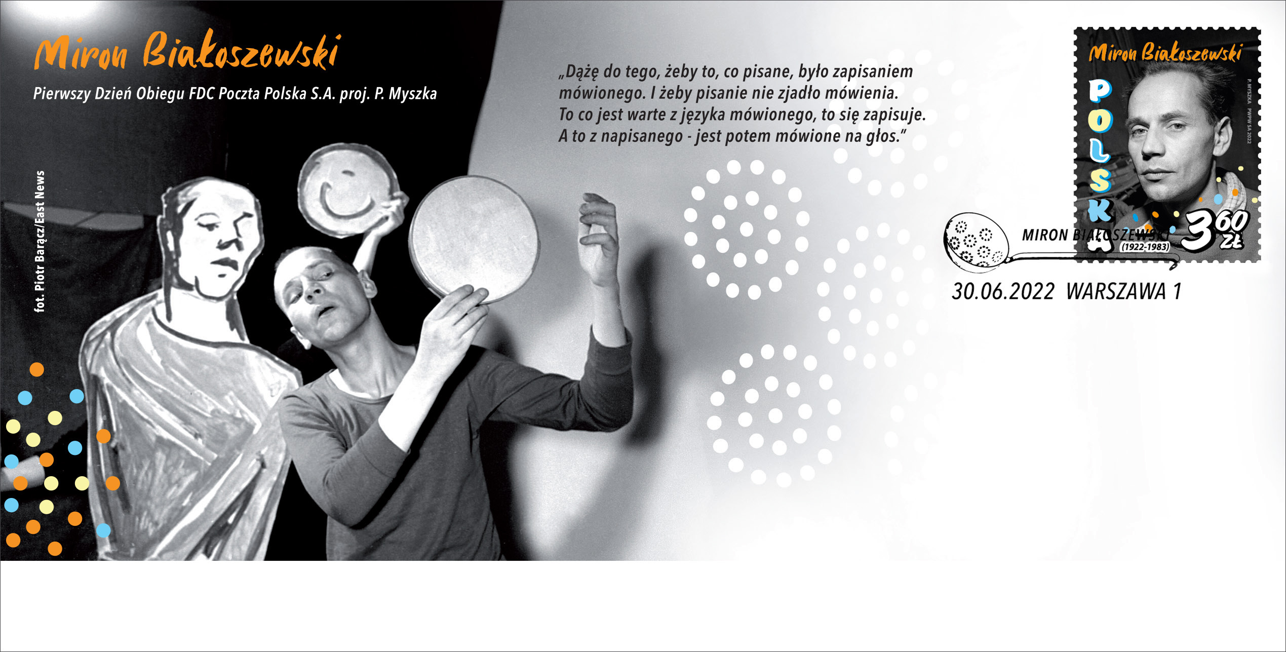 Na wyemitowanym przez Pocztę Polską znaczku pocztowym przedstawiony jest fotograficzny portret Mirona Białoszewskiego. Na kopercie FDC – również wydanej z okazji rocznicy – zamieszczono zdjęcie artysty wykonane w trakcie jednego ze spektakli „Teatru Osobnego” oraz cytat zawierający słowa poety dotyczące jego eksperymentów ze słowem mówionym i pisanym. W grafice datownika, który również jest dostępny od 30 czerwca, widnieje łyżka cedzakowa – jeden z wysławianych przez Białoszewskiego przedmiotów codziennego użytku, które zajmują wiele miejsca w jego twórczości poetyckiej.