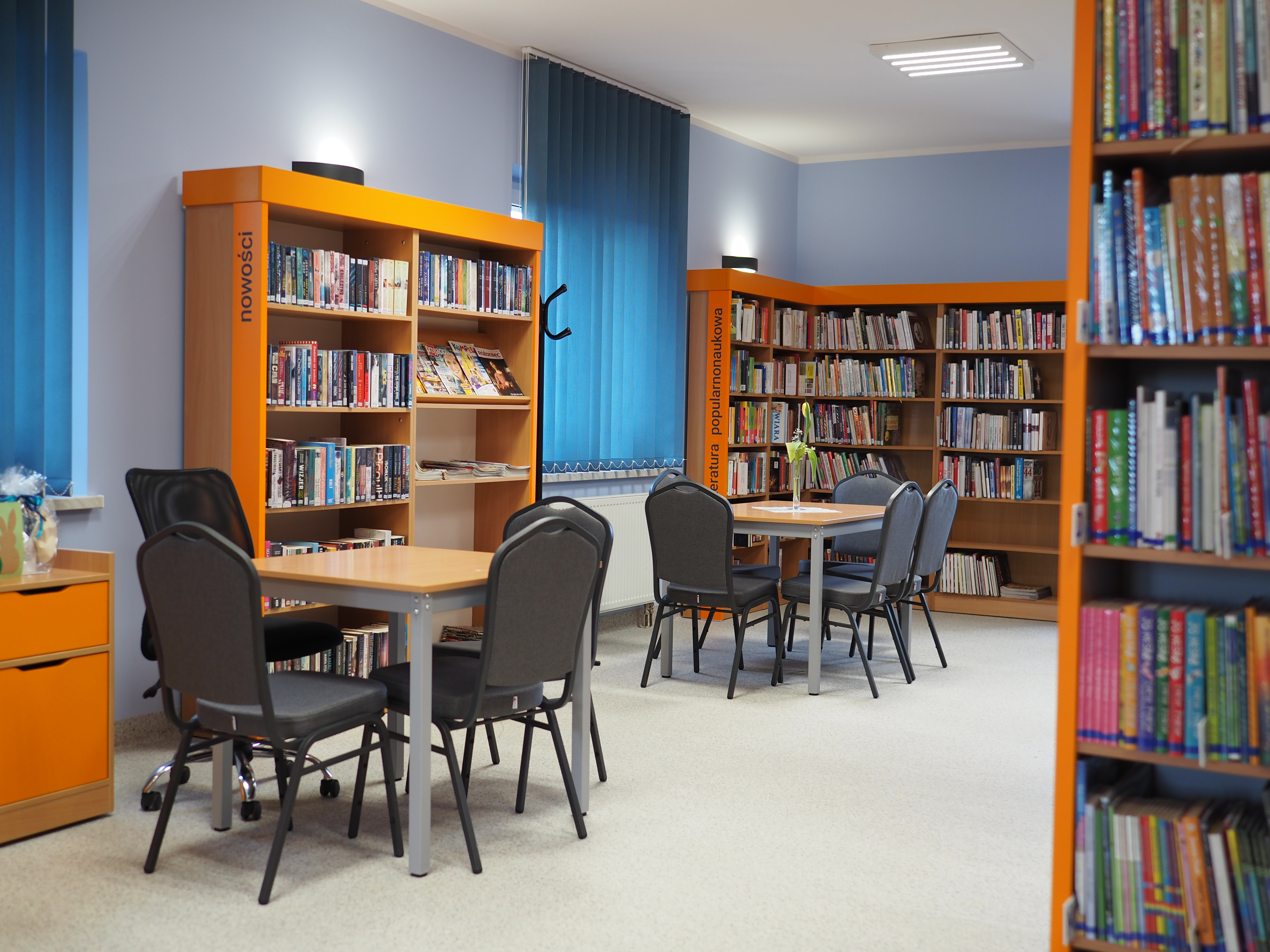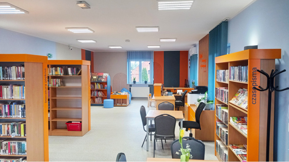 Wnętrze biblioteki po modernizacji zyskało nowy układ pomieszczeń o przyjemnym i nowoczesnym wystroju. W obiekcie powstała wypożyczalnia z wydzieloną strefą dla dzieci i młodzieży, czytelnia, pokój seniora, sala konferencyjna. Wydzielenie przestrzeni dla różnych grup wiekowych ułatwi przygotowanie dla użytkowników specjalnej oferty kulturalnej i usługowej mającej rozwijać ich pasje, zainteresowania, kreatywność i wyobraźnię. W ramach zadania zakupiono nowy sprzęt komputerowy oraz roboty edukacyjne.