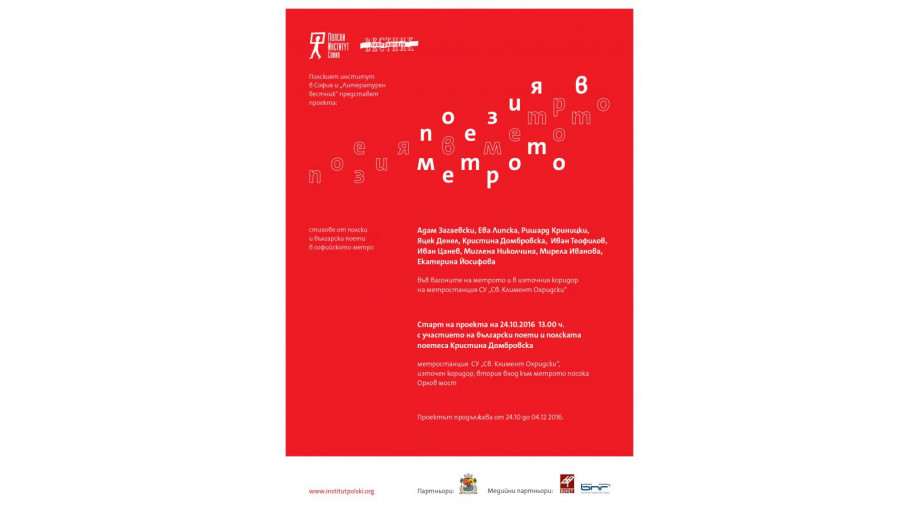 Współczesna polska i bułgarska poezja gości od poniedziałku w sofijskim metrze. Wspólny projekt, przedstawiający kilka znanych autorów z obu państw, jest dziełem Instytutu Polskiego w Sofii i tygodnika „Literaturen westnik″.