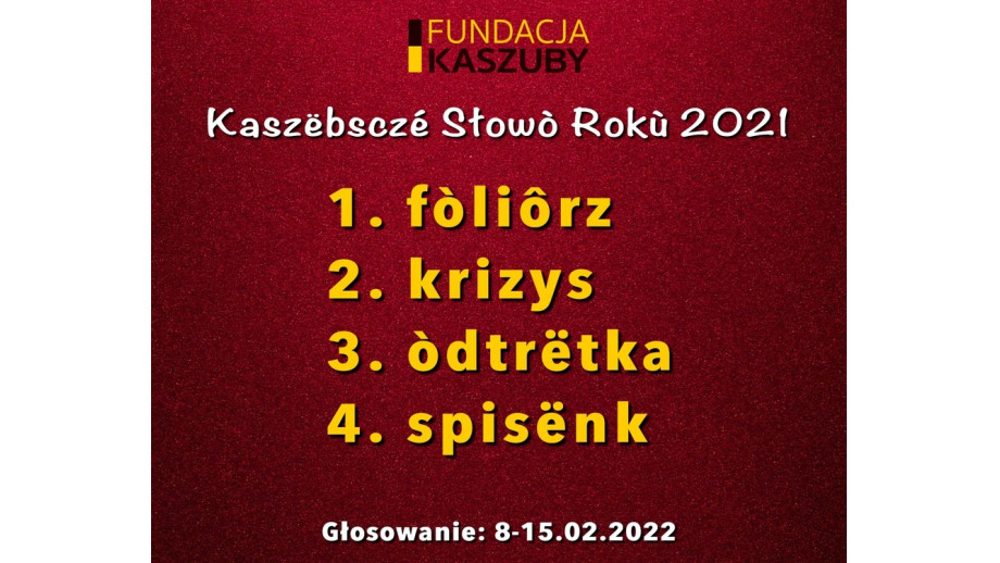 Do 15 lutego potrwa głosowanie internetowe na Kaszubskie Słowo Roku 2021. Do wyboru są cztery, zgłoszone wcześniej przez internautów, propozycje. Organizowany po raz drugi przez Fundację Kaszuby konkurs wystartował we wtorek.