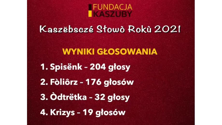 W pierwszym etapie internauci przesłali 56 propozycji słów i wyrażeń kaszubskich, z których organizator konkursu gdańska Fundacja Kaszuby, wytypowała finałową czwórkę: foliôrz – antyszczepionkowiec, osoba wierząca w teorie spiskowe; krizys – kryzys, zła sytuacja gospodarczo-ekonomiczna; odtrëtka – odtrutka, szczepionka oraz spisënk – krótsza nazwa Narodowego Spisu Powszechnego.