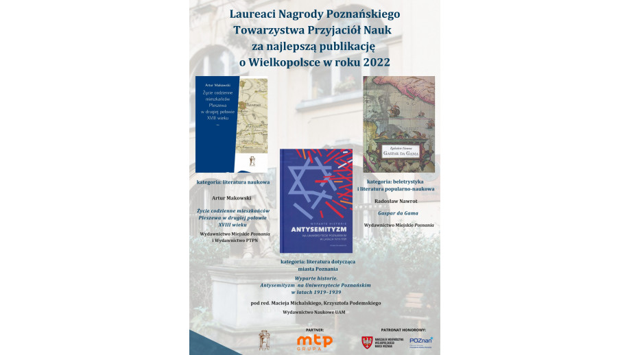 Wręczono Nagrody Poznańskiego Towarzystwa Przyjaciół Nauk za najlepszą publikację o Wielkopolsce w 2022. W tym roku, już po raz szósty, nagrodzono autorów najlepszych prac w kategoriach: literatura naukowa, literatura popularnonaukowa i beletrystyka oraz literatura dotycząca miasta Poznania.