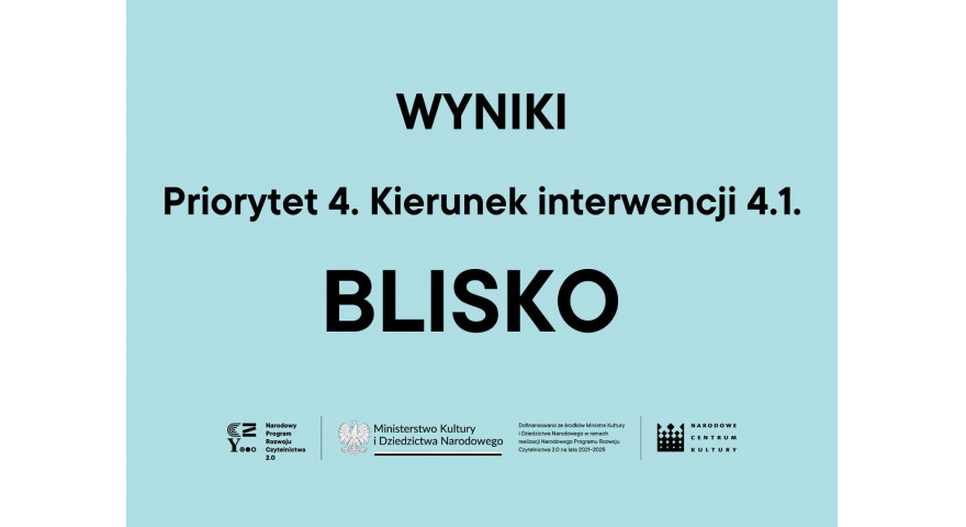 Narodowe Centrum Kultury, będące Operatorem Priorytetu 4 Narodowego Programu Rozwoju Czytelnictwa 2.0. na lata 2021-2025, ogłasza trzeci nabór wniosków do konkursu dotacyjnego BLISKO (Kierunek Interwencji 4.1 NPRCz 2.0) o budżecie 5,5 mln zł, na realizację zadań w latach 2023-2024.